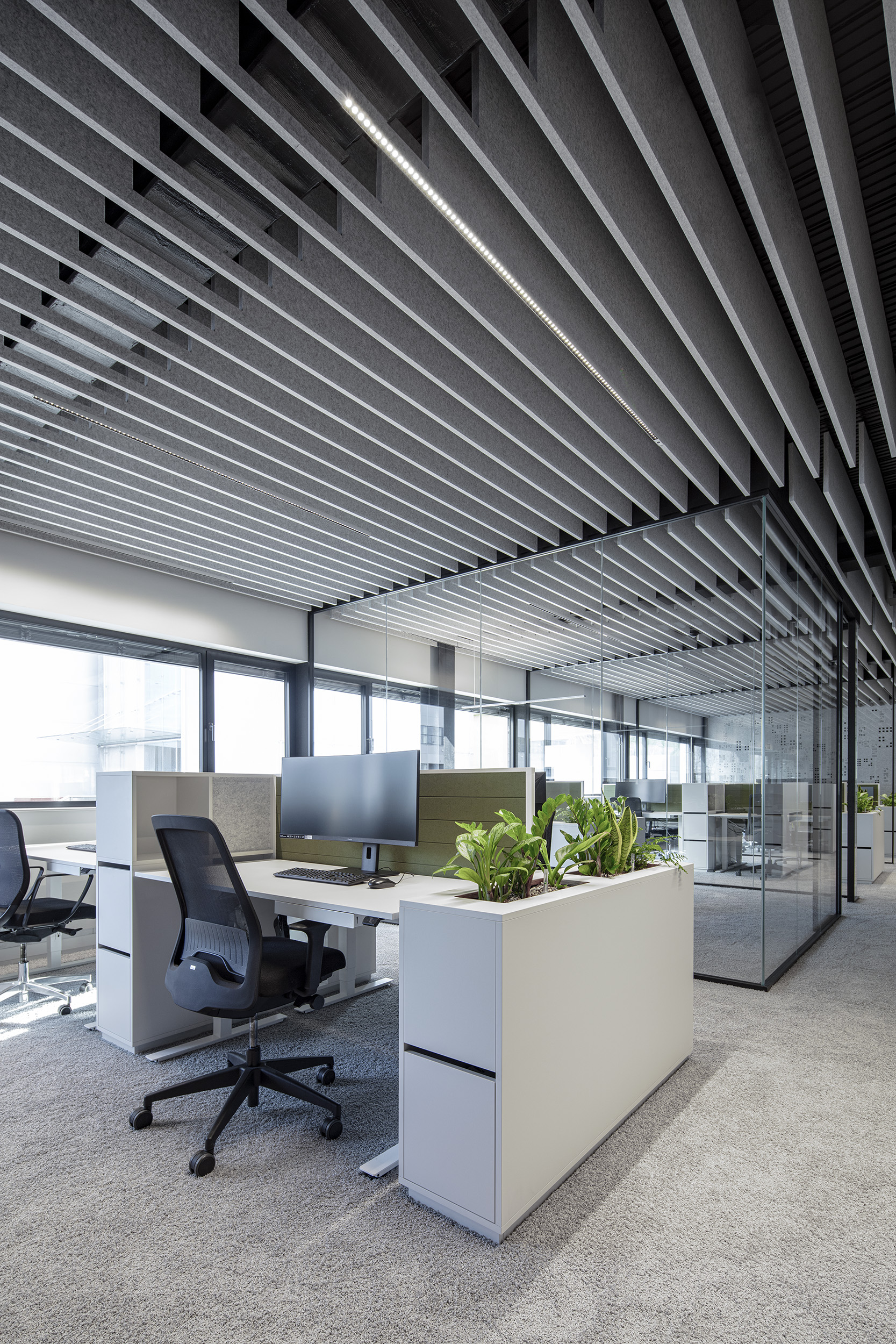 At only 25 mm wide, the narrow acoustic elements are particularly elegant while still offering high-quality lighting solutions that are seamlessly integrated into the element.